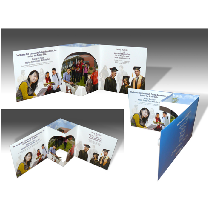 Direct mailer piece designed for Bunkerhill Community College fundraiser. Designed mechanical custom die cut for piece. Press-check and production.