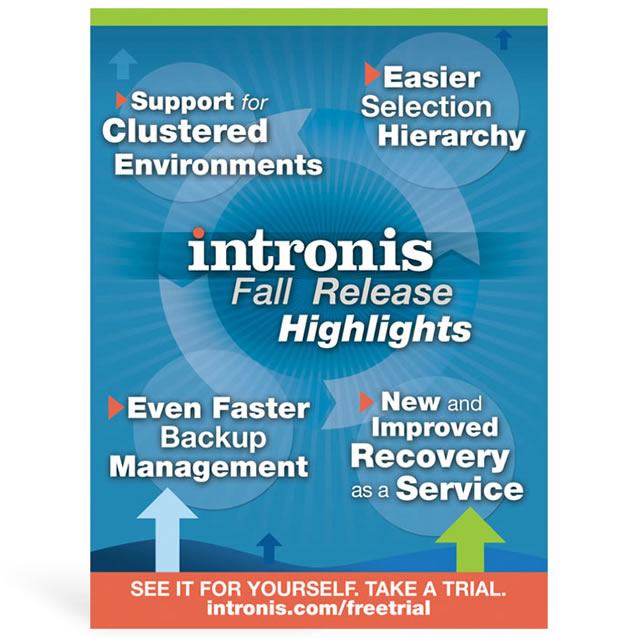for Intronis cloud server and backup. Banner highlights for Fall software release.