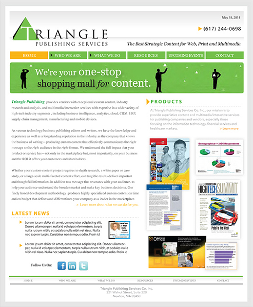 Website design and build for Triangle Publishing Services. Project management, branding/logo design, art direction, produce illustrations for website, CSS, Flash, html.